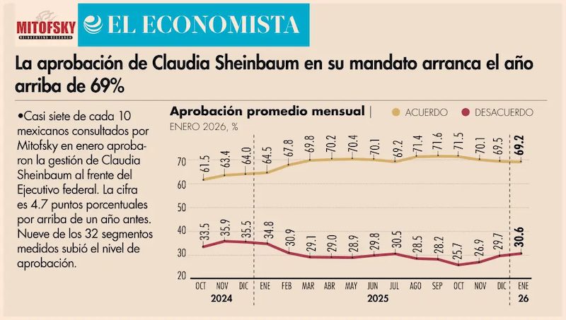 La encuesta telefónica nacional, levantada por la empresa Mitofsky para El Economista entre 67,782 ciudadanos con dispositivo móvil inteligente y acceso a Internet, destaca la “alta aprobación de Sheinbaum al inicio de 2026, en un contexto de presión política y económica”.