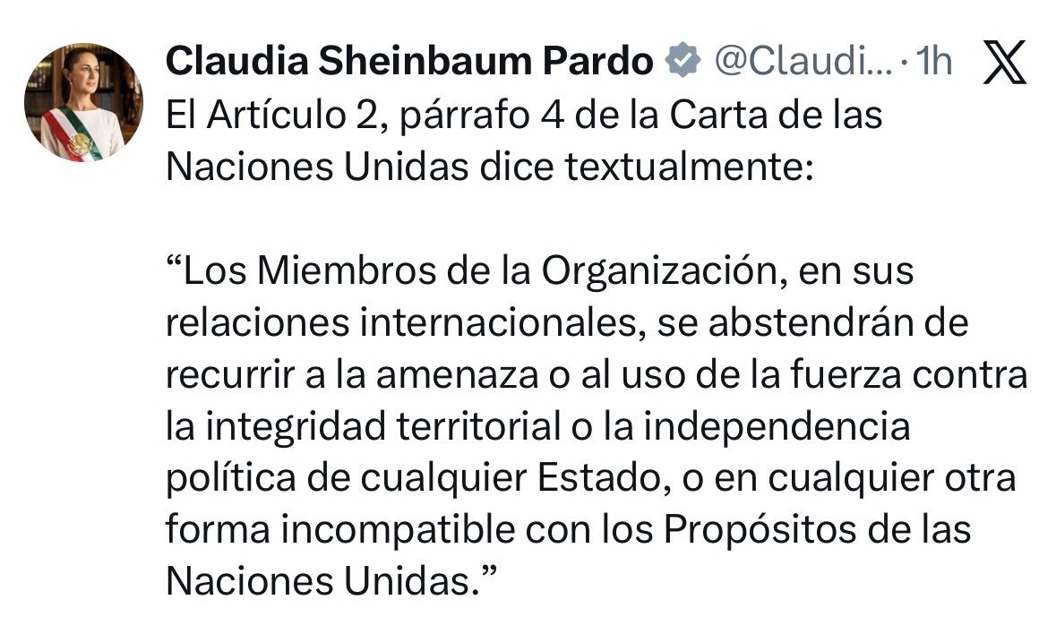 El Gobierno de México condena y rechaza enérgicamente las acciones militares ejecutadas unilateralmente en las últimas horas por fuerzas armadas de los Estados Unidos de América contra objetivos en territorio de la República Bolivariana de Venezuela, en clara violación del artículo 2 de la Carta de la Organización de las Naciones Unidas (ONU).