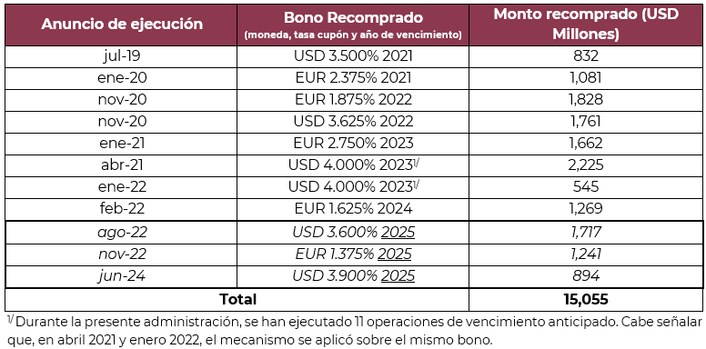 Durante el periodo 2019-2024, se ha refinanciado aproximadamente 15,055 millones de dólares mediante el uso de la cláusula de vencimiento anticipado, como se detalla a continuación: