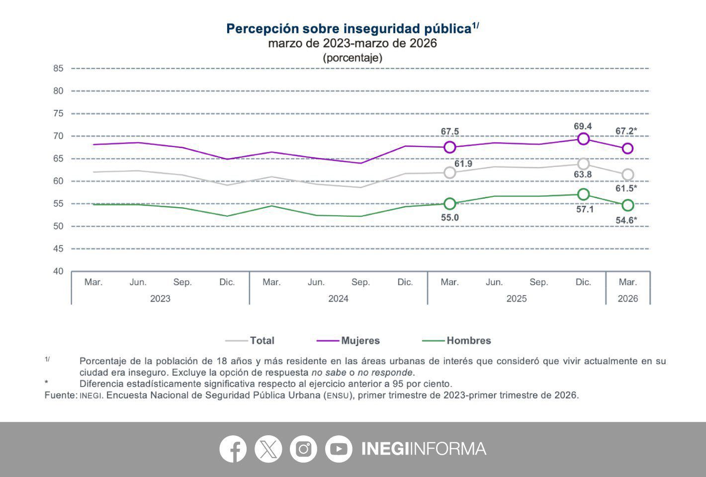 Al cierre del primer trimestre de 2026, el 61.5 % de la población adulta en México considera que vivir en su ciudad es inseguro, de acuerdo con los resultados de la Encuesta Nacional de Seguridad Pública Urbana (ENSU) publicados por el INEGI este 24 de abril.