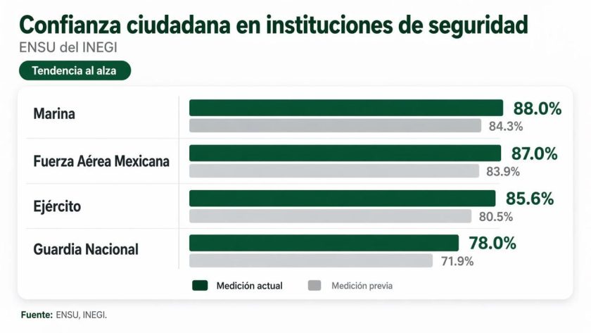 Pese a la percepción de inseguridad, las fuerzas armadas mantienen altos niveles de aprobación. La Marina encabeza la lista con un 87.3 % de percepción de desempeño efectivo, seguida por el Ejército (85.5 %) y la Guardia Nacional (77.0 %). En el extremo opuesto, las policías preventivas municipales apenas logran un 50.8 % de confianza.