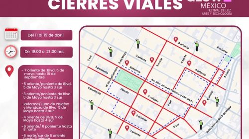 Con motivo del Festival Glow México, se implementarán cierres a la circulación en el Centro Histórico del 11 al 19 de abril, a partir de las 18:00 a 21:00hrs. Las afectaciones viales abarcan distintos puntos alrededor del Zócalo y vialidades principales como Blvd. 5 de Mayo, Reforma y...