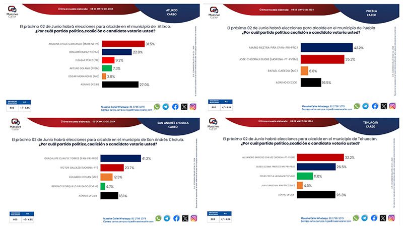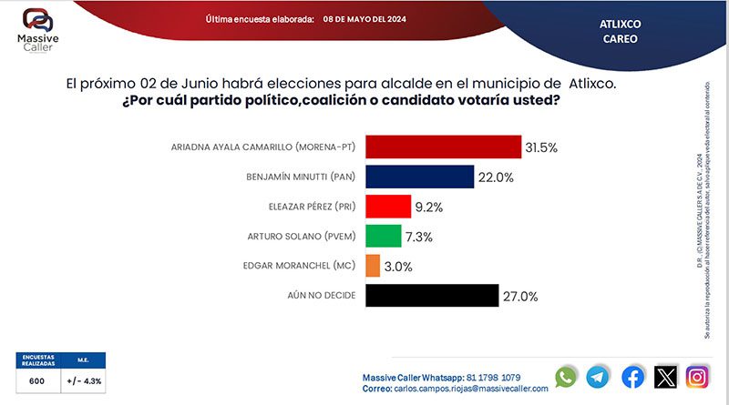 En tanto, en el municipio de Atlixco, la abanderada de la alianza Morena-PT, Ariadna Ayala, encabeza las preferencias electorales con el 31.5 por ciento; le sigue el candidato panista Benjamín Minutti con el 22 por ciento; en tercer lugar, aparece el candidato priista Eleazar Pérez con el 9.2 por ciento.