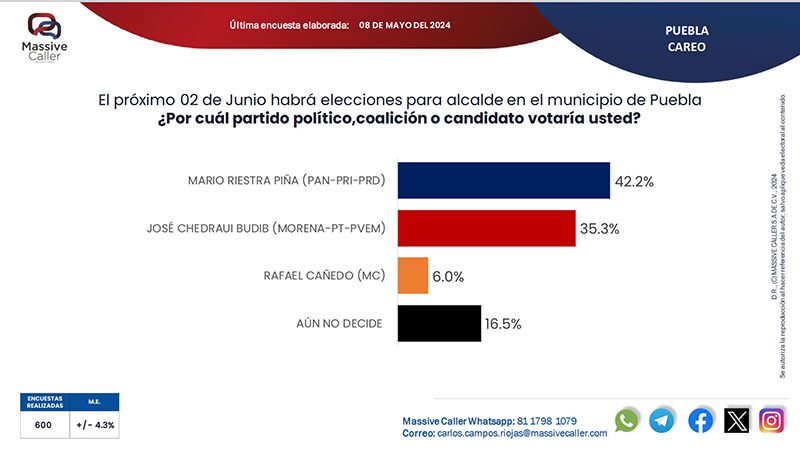 En la ciudad de Puebla, los números favorecen a Mario Riestra, abanderado de la coalición “Un Mejor Rumbo para Puebla”, quien cuenta con una preferencia electora del 42.2 por ciento; le sigue José Chedraui, candidato de Morena-PT-PVEM, con el 35.3 por ciento; en tanto, en tercer lugar, Rafael Cañedo, con el 6 por ciento.