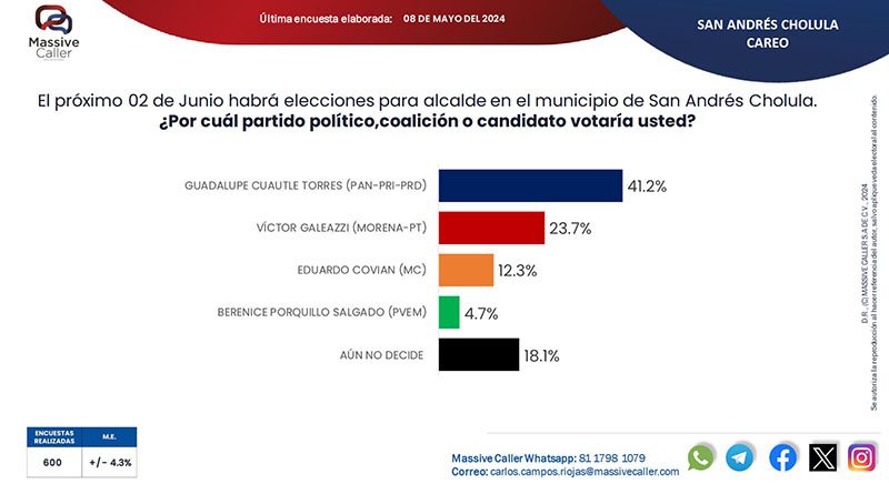 Por su parte, en San Andrés Cholula, la candidata Guadalupe Cuautle arrasa. La abanderada por la coalición PAN-PRI-PRD tiene un 41.2 por ciento de las preferencias electorales. Le sigue el abanderado de Morena-PT-PVEM, Víctor Galeazzi, con un 23.7 por ciento; en tercer lugar, se ubica Eduardo Covián, de Movimiento Ciudadano, con el 12.3 por ciento de las preferencias.