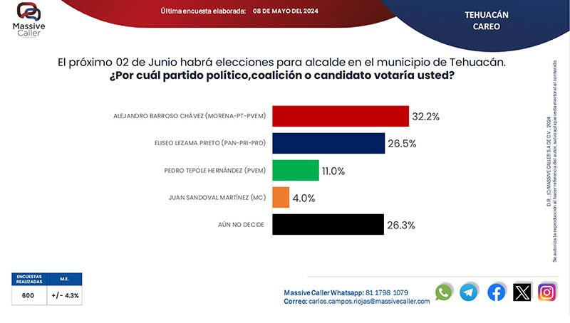 A decir de Massive Caller, en el municipio de Tehuacán, Alejando Barroso, candidato a la de Morena-PT-PVEM a la alcaldía, encabeza la preferencia electoral, con el 32.2 %; le sigue el panista Eliseo Lezama, de la coalición PAN-PRI-PRD, con el 26.5 por ciento; el alcalde con licencia, Pedro Tepole, tiene el 11 por ciento; el abanderado de Movimiento Ciudadano, Juan Sandoval tiene el 4 por ciento.