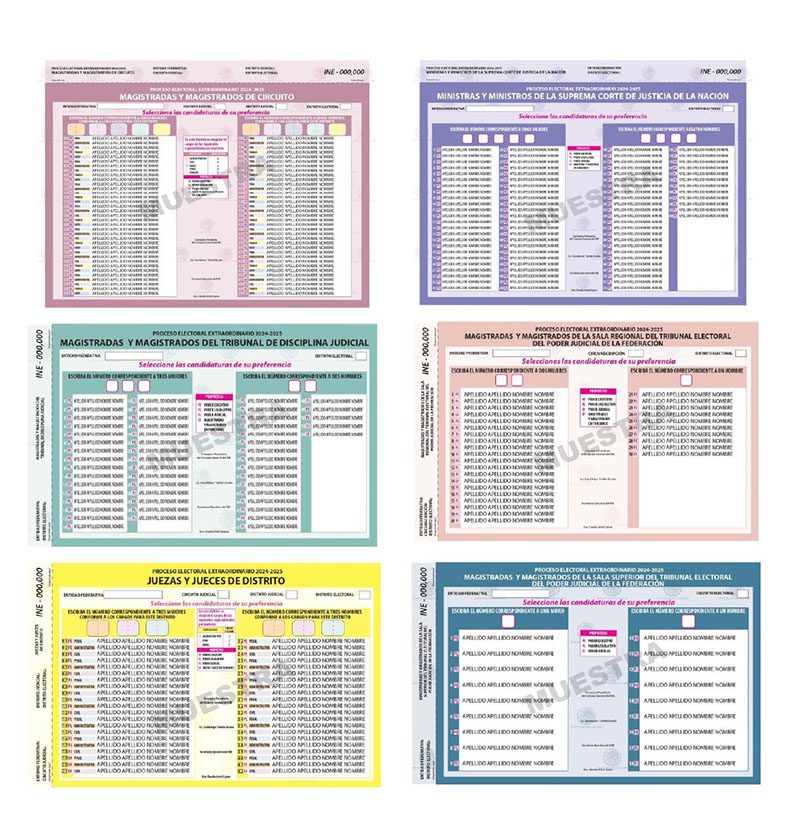 El Instituto Nacional Electoral (INE) diseñó y aprobó seis diferentes tipos de boletas electorales para el Proceso Electoral Extraordinario para la Elección de diversos cargos del Poder Judicial de la Federación (PEEPJF) 2024-2025, las cuales contarán con elementos que dotan de certeza y facilitarán la forma en que las y los ciudadanos podrán emitir su voto el próximo 1 de junio.