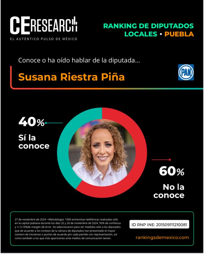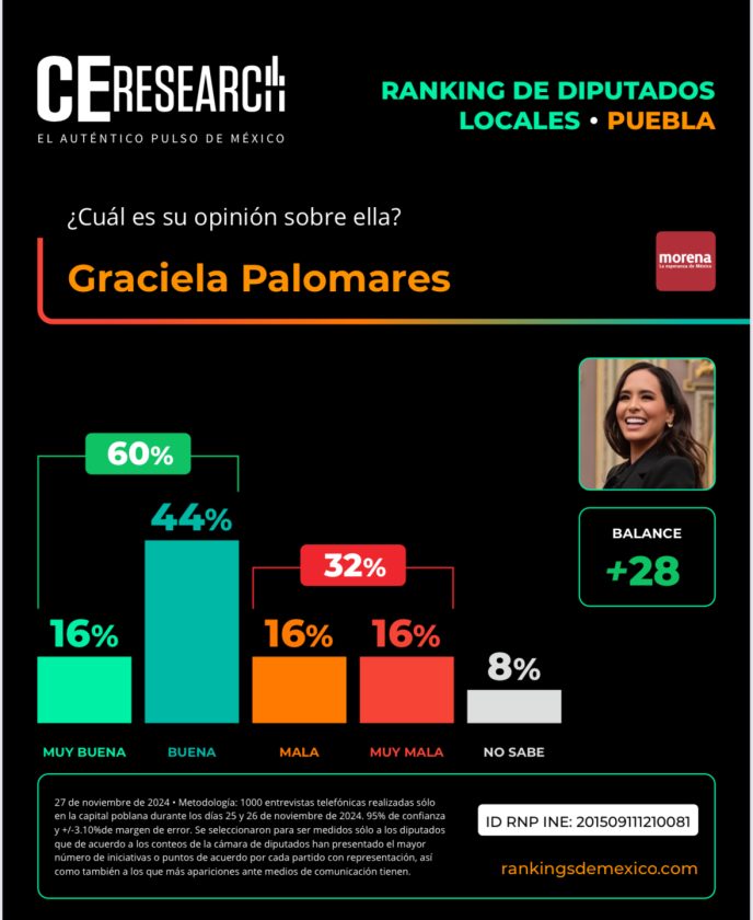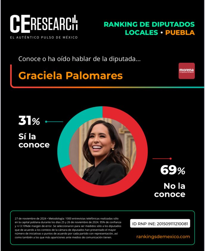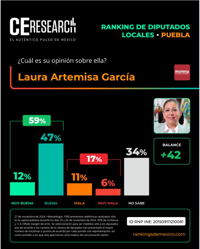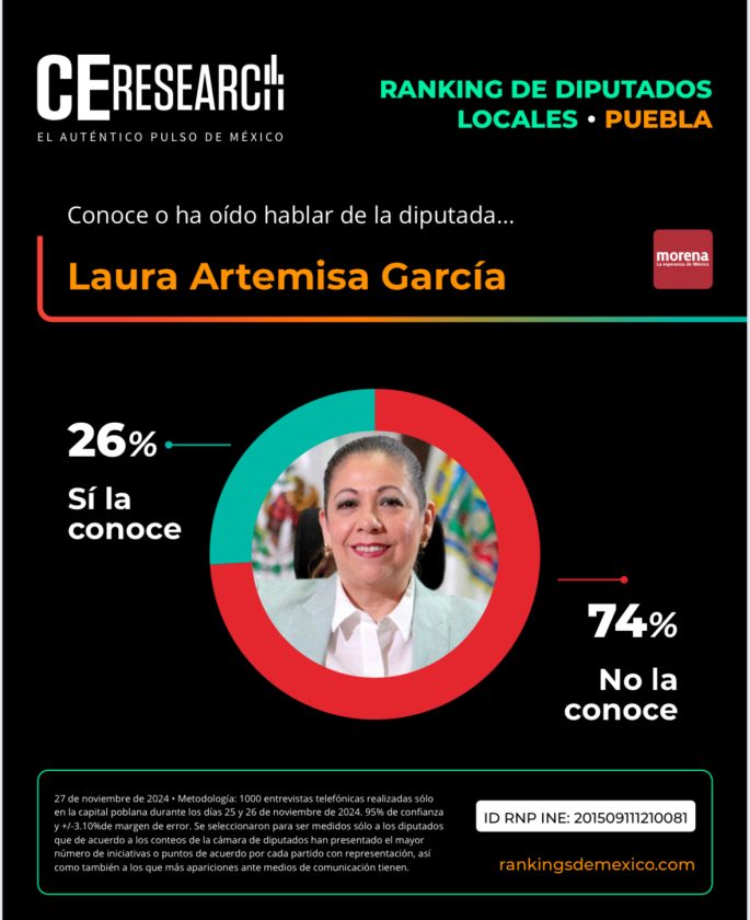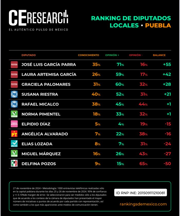 Le siguen, en rango de mayor a menor percepción positiva ciudadana, las diputadas Laura Artemisa García (Morena), Graciela Palomares (Morena), y Susana Riestra (PAN).