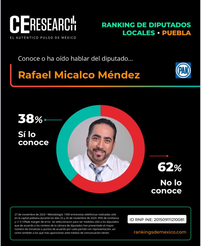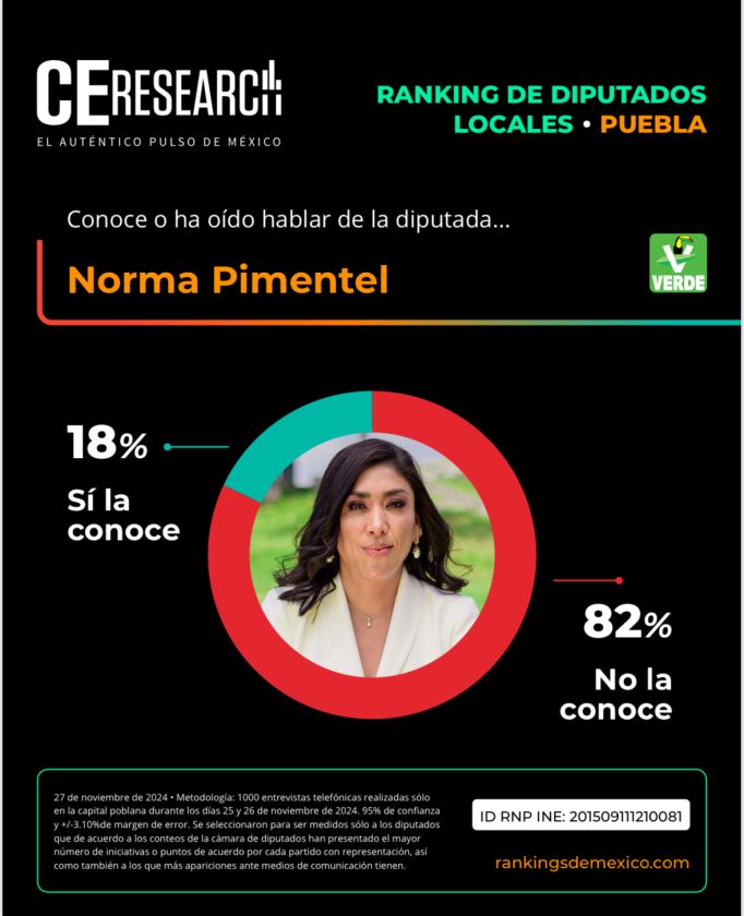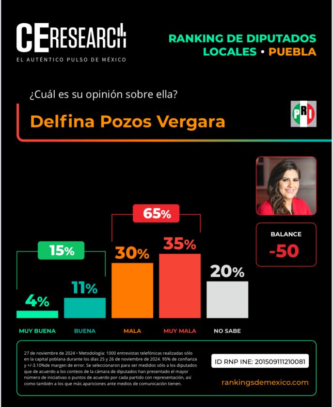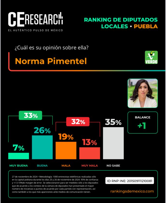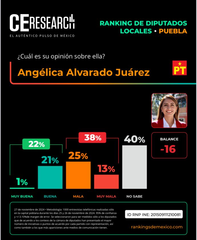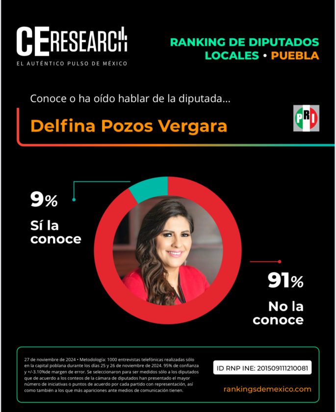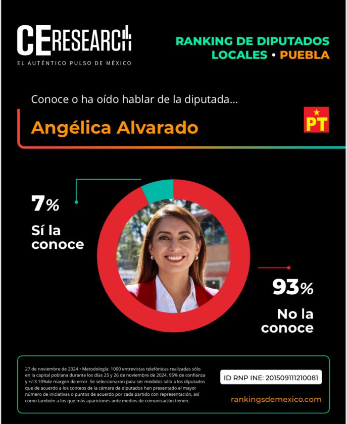 Le siguen, en rango de mayor a menor percepción positiva ciudadana, las diputadas Laura Artemisa García (Morena), Graciela Palomares (Morena), y Susana Riestra (PAN).