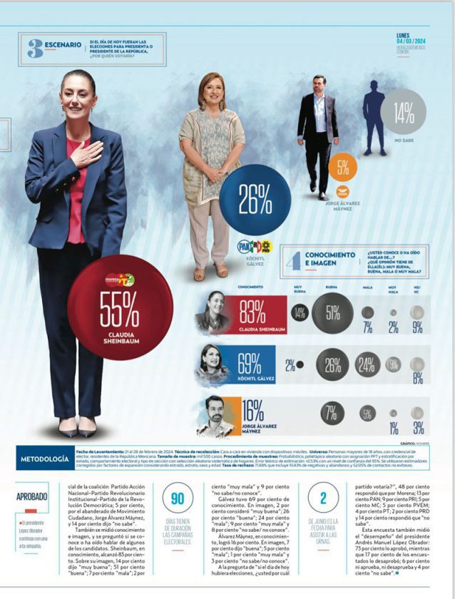 A la pregunta de “Si el día de hoy fueran las elecciones para Presidenta o Presidente, ¿por quién votaría?”, 55 por ciento votaría por Sheinbaum; 26 por ciento por Xóchitl Gálvez, candidata presidencial de la coalición Partido Acción Nacional-Partido Revolucionario Institucional-Partido de la Revolución Democrática; 5 por ciento, por el abanderado de Movimiento Ciudadano, Jorge Álvarez Máynez, y 14 por ciento dijo “no sabe”.