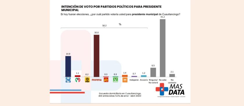 Ante la pregunta Sí hoy fueran las elecciones ¿Por cuál partido votaría para la presidencia municipal de Cuautlancingo?, la coalición morenista obtuvo el 30.0% contra el 14.9% del PAN, 1.1% del PRI, 0.2% del PRD y 1.4 de Movimiento Ciudadano.