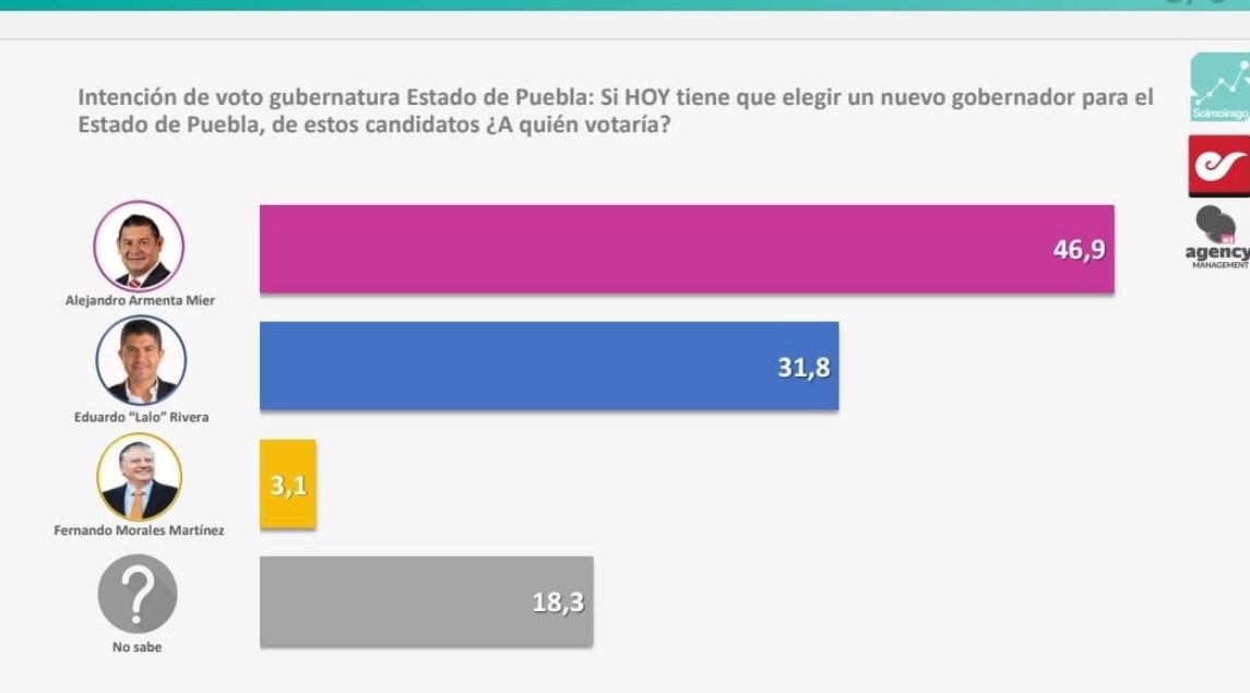 De acuerdo con los resultados del tracking de la encuestadora argentina Solmoirago e Intolerancia Media Group, Alejandro Armenta, abanderado de la coalición Sigamos Haciendo Historia (Morena, PT, PVEM, Nueva Alianza Puebla y FXM) tiene el 46.9% de la preferencia electoral, mientras que el candidato opositor tiene un 31.8%.