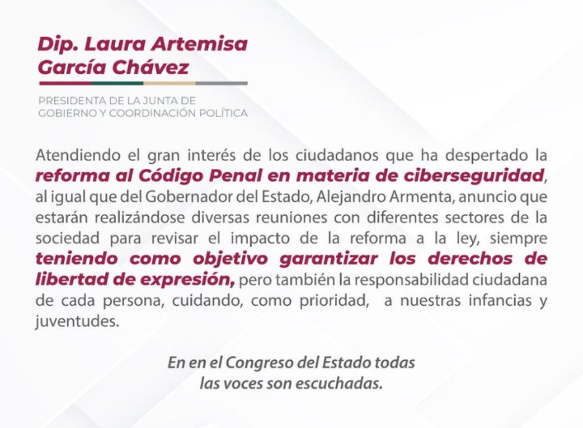 La presidenta de la Junta de Gobierno y Coordinación Política (JUGOCOPO), Laura Artemisa García Chávez, anunció la realización de jornadas formativas dirigidas a especialistas, colectivos ciudadanos y diversos sectores sociales con respecto a la reforma al Código Penal en materia de ciberseguridad.