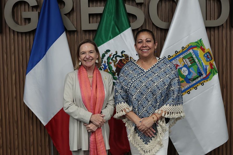 Con la finalidad de estrechar los vínculos internacionales y la diplomacia parlamentaria, así como fortalecer las relaciones comerciales, la diputada presidenta de la Junta de Gobierno y Coordinación Política del Congreso del Estado, Laura Artemisa García Chávez recibió en la sede del Poder Legislativo a la embajadora de Francia en México, Delphine Borione.