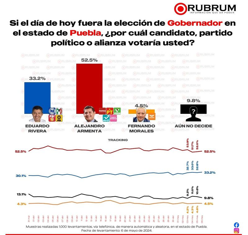 A menos de 3 semanas de la jornada electoral, Alejandro Armenta, candidato de la coalición Sigamos Haciendo Historia (Morena, PT, PVEM, Nueva Alianza, Fuerza X México), se coloca el frente en la preferencia electoral con un 52.5 por ciento, frente al abanderado opositor.