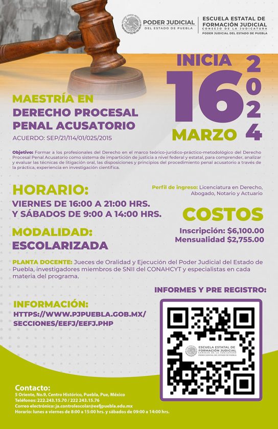 El Poder Judicial del Estado, a través de la Escuela Estatal de Formación Judicial (EEFJ) del Consejo de la Judicatura, informa la apertura de inscripciones a la Maestría en Derecho Procesal Penal Acusatorio, que iniciará actividades el próximo 16 de marzo.