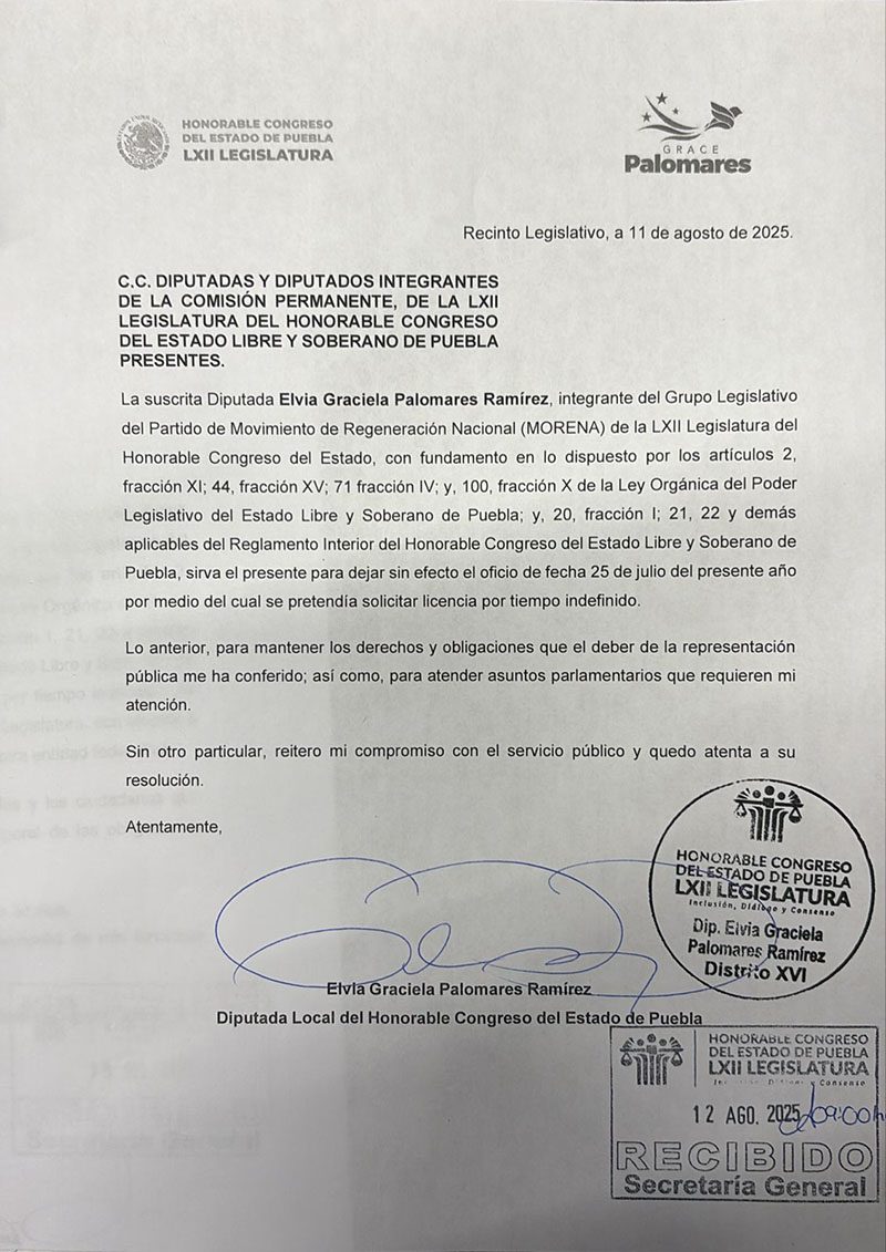 La diputada Elvia Graciela Palomares Ramírez, integrante del Grupo Legislativo de Morena en la LXII Legislatura del Honorable Congreso del Estado Libre y Soberano de Puebla, informó mediante un comunicado oficial que dejó sin efecto la solicitud de licencia por tiempo indefinido que había presentado el pasado 25 de julio.