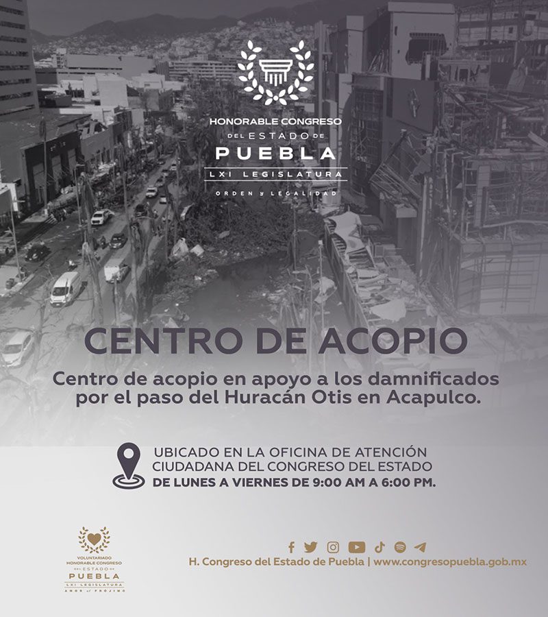 El Congreso del Estado de Puebla, a través del Voluntariado, habilitó un centro de acopio en apoyo a las personas damnificadas por el paso del Huracán Otis en Guerrero; a partir de este 27 de octubre se recibirán víveres y artículos de primera necesidad.