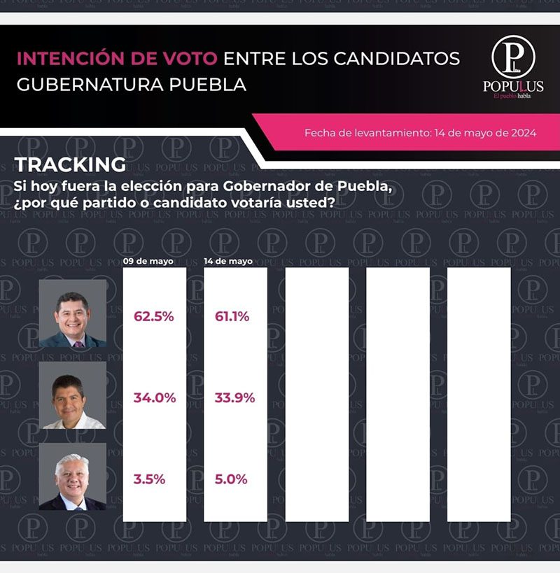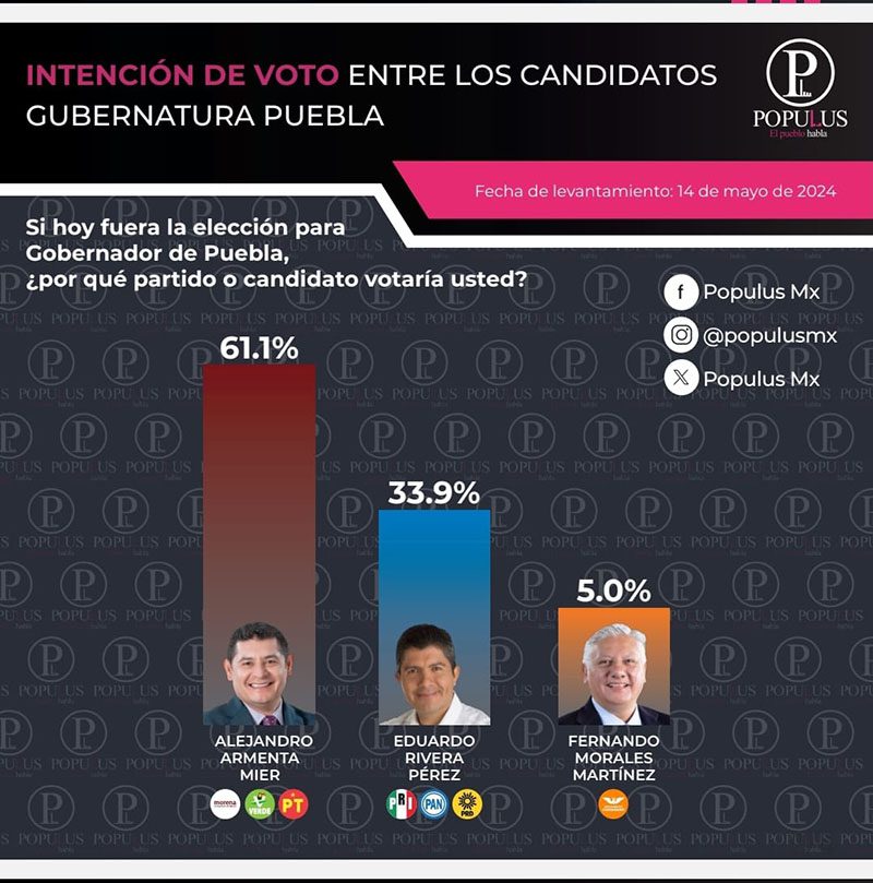 El muestreo de Populus Mx tiene un nivel de confianza de 95 por ciento con un margen de error del 4 por ciento y se realizó entre ciudadanas y ciudadanos de Puebla mayores de 18 años el martes 14 de mayo.