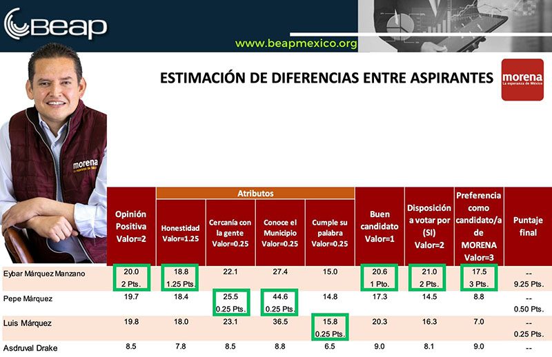 Con 9 puntos de 10, Eybar Márquez Manzano se coloca como el único aspirante en cumplir con las ponderaciones de Morena, información expuesta por el Buró de Estadística y Análisis de Opinión Pública (BEAP), en su más reciente encuesta realizada del 12 al 16 de febrero en el municipio de Zacatlán.