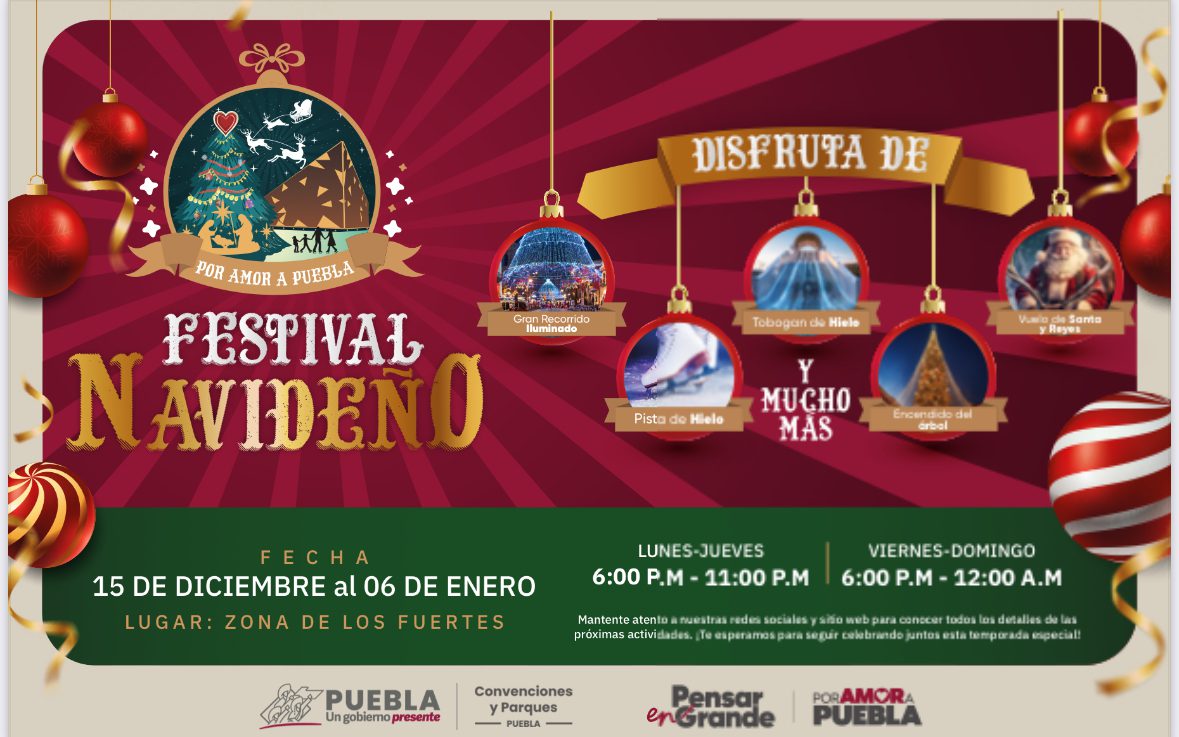 Del 15 de diciembre al 6 de enero, la magia de la Navidad brillará intensamente en los emblemáticos Fuertes de Loreto con el esperado Festival Navideño «Por Amor a Puebla». Este evento, diseñado para toda la familia, será encabezado por el gobernador electo, Alejandro Armenta, y estará a cargo de la Dirección de Parques y Convenciones del Estado, presidida por Michelle Talavera Herrera.