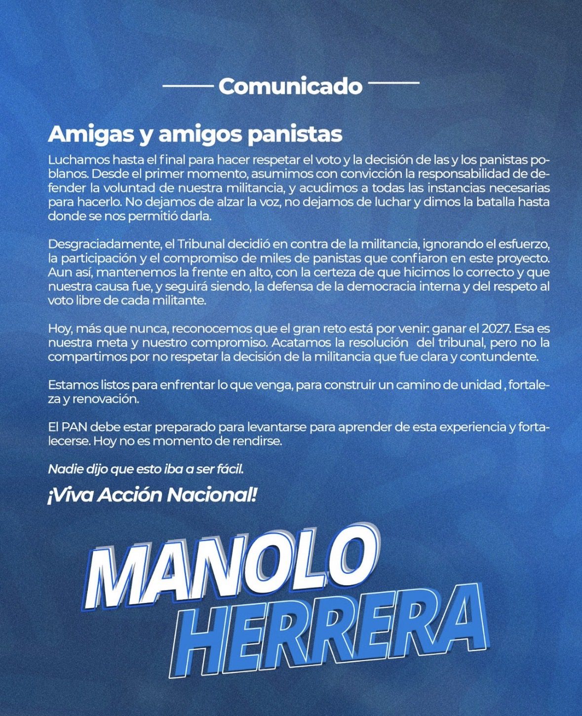 A través de un comunicado, Herrera Rojas aseguró que su equipo “luchó hasta el final” para defender el voto y la decisión de los panistas poblanos. Señaló que acudieron a todas las instancias necesarias para hacer valer la elección interna y que, pese al fallo en contra, mantienen “la frente en alto” con la certeza de haber actuado correctamente.