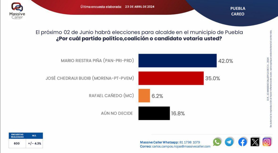 El candidato en unidad del PAN, PRI, PRD y PSI a la Presidencia Municipal de Puebla, Mario Riestra, sigue a la cabeza en las preferencias electorales, según los resultados más recientes de la encuesta realizada por Massive Caller.