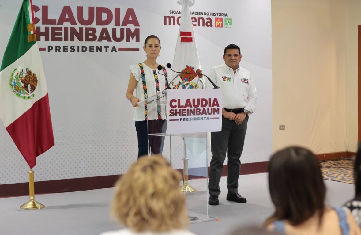 En conferencia de prensa, Claudia Sheinbaum estuvo acompañada de Javier May Rodríguez, candidato a la gubernatura de Tabasco, quien destacó que la visita de la abanderada de la colación ‘’Sigamos Haciendo Historia’’ a la Presidencia de la República como un hecho histórico que marca el avance de la 4T en Tabasco.