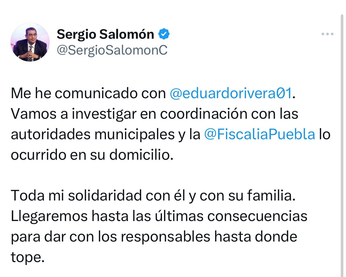 El gobernador de Puebla, Sergio Salomón Céspedes Peregrina, dio a conocer que se llegarán hasta las últimas consecuencias del hecho ocurrido en la casa de Eduardo Rivera, candidato a la gubernatura por el PAN-PRI-PRD-PSI.