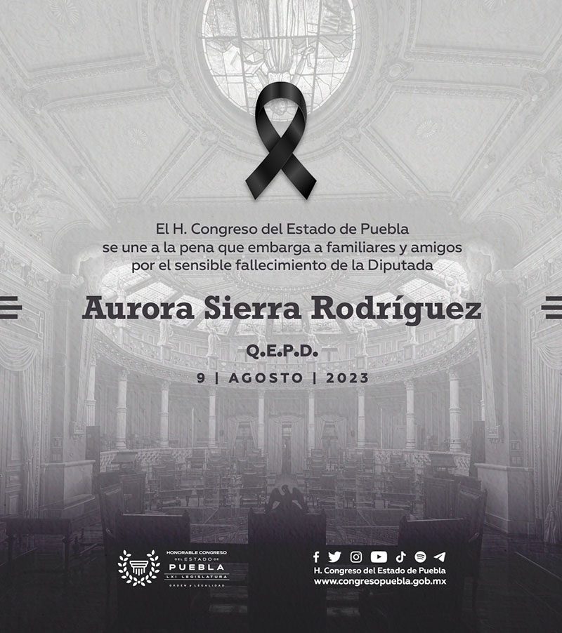 El Congreso del Estado de Puebla se suma a la pena que embarga a familiares y seres queridos de nuestra amiga y compañera Diputada Aurora Sierra Rodríguez, fallecida este miércoles.