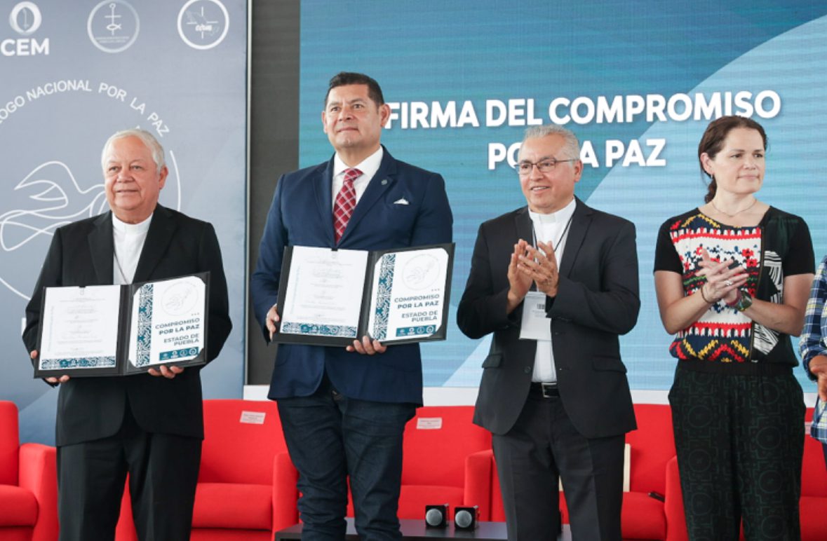 A la Firma del Compromiso por la Paz, entre los candidatos a la gubernatura, asistió Alejandro Armenta Mier, de Morena, acompañado de catedráticos de diferentes universidades y representantes de la Conferencia del Episcopado Mexicano.
