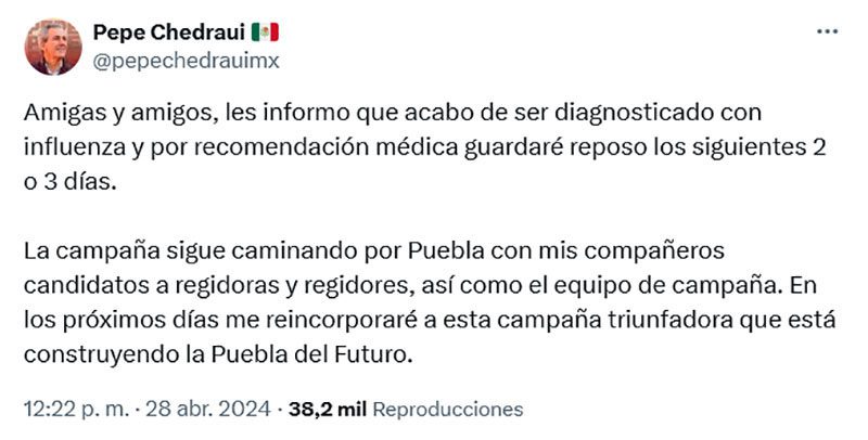 Por medio de sus redes sociales, el candidato a la alcaldía de Puebla por la coalición «Sigamos Haciendo Historia», Pepe Chedraui, informó que fue diagnosticado con influenza, por lo que estará resguardado los próximos 3 días.