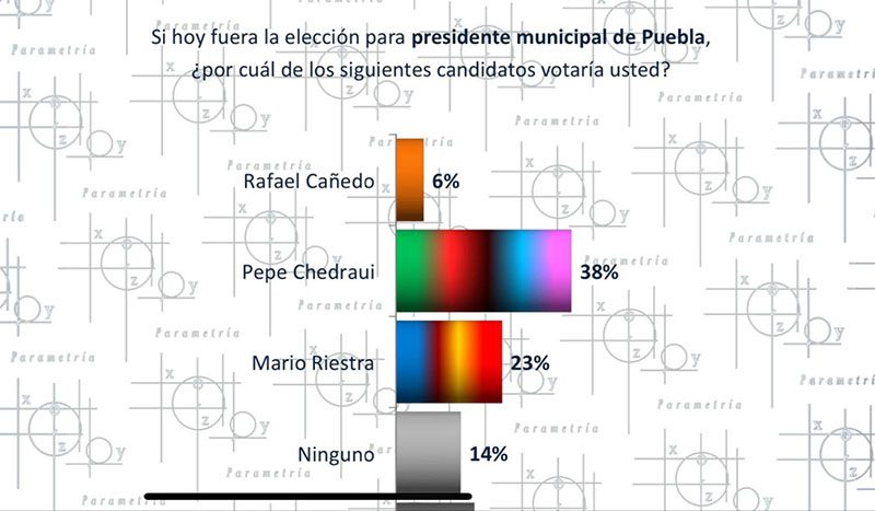 Es decir, que en la pregunta “Si hoy fuera la elección para presidente municipal de Puebla ¿Por cuál de los siguientes candidatos votaría usted?, Pepe Chedraui tuvo una respuesta favorable del 38 por ciento, lo que representa un aumento de tres puntos en comparación con marzo.