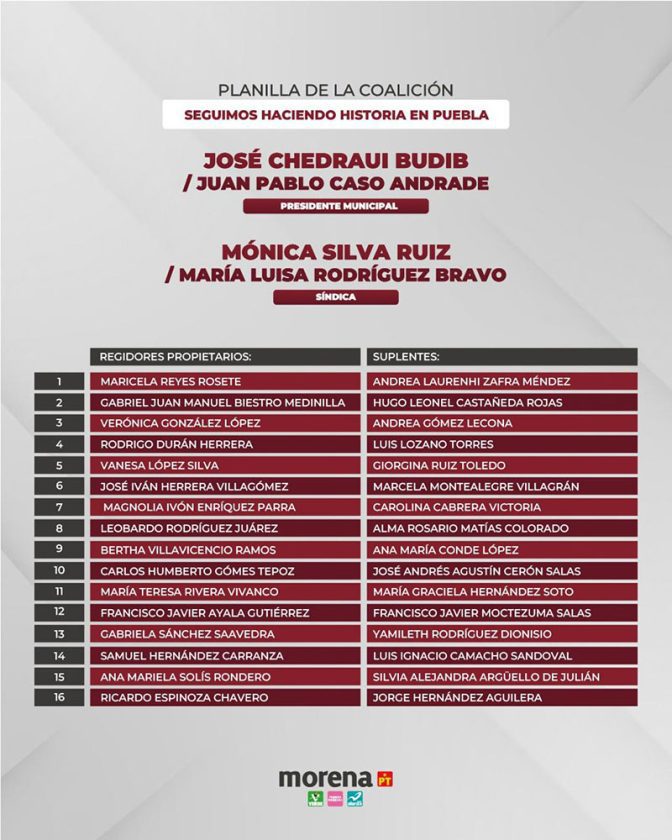 En esta era decisiva para la ciudad de Puebla se requiere de personas que cuenten con los mejores perfiles para traer los avances de la transformación en una segunda etapa. Por lo tanto, el candidato por la Coalición Seguiremos Haciendo Historia a la presidencia municipal de la capital, Pepe Chedraui, contará con una planilla plural de regidores, que represente a todos los poblanos y capaz de hacer frente a las necesidades de la ciudadanía.