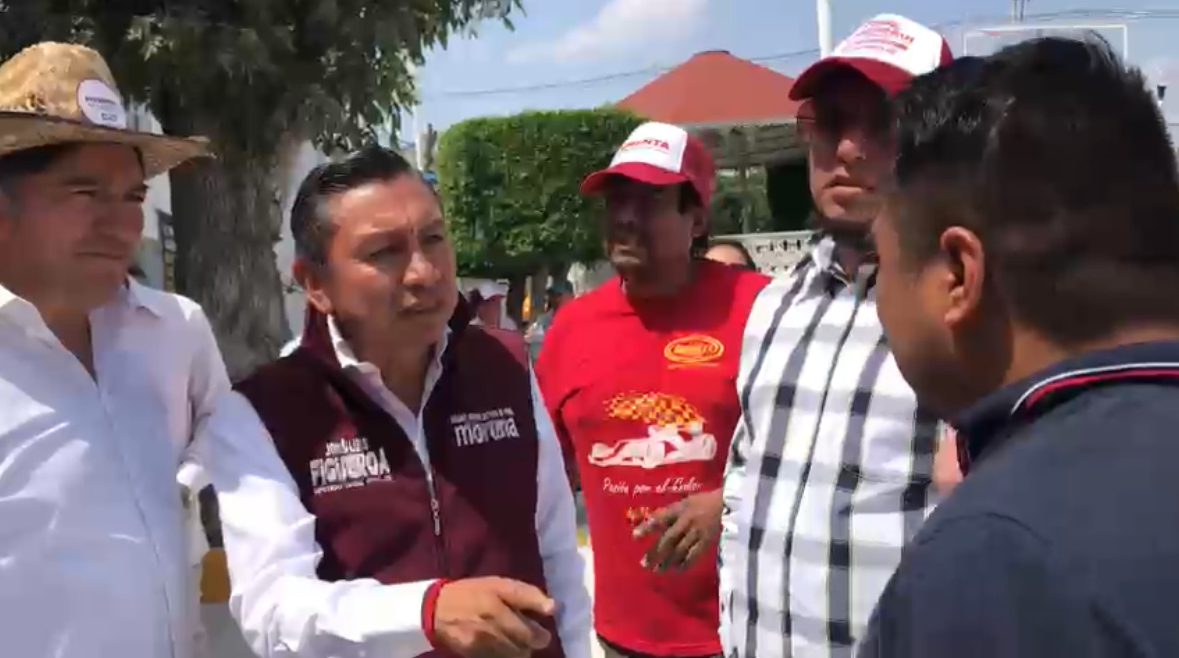 El presidente auxiliar de San Pedro Zacachimalpa jaloneó al candidato de Morena, José Luis Figueroa quien caminaba por la plaza principal de la Junta Auxiliar en labores de campaña.