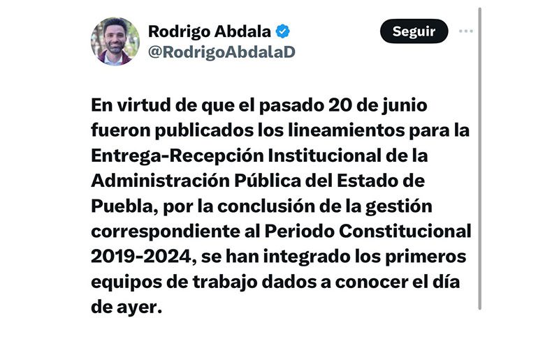 En virtud de los trabajos realizados por los equipos del gobierno de transición del gobernador electo Alejandro Armenta, se informa que el pasado 20 de junio se publicaron los lineamientos para la Entrega-Recepción Institucional de la Administración Pública del Estado de Puebla, correspondiente al Periodo Constitucional 2019-2024.