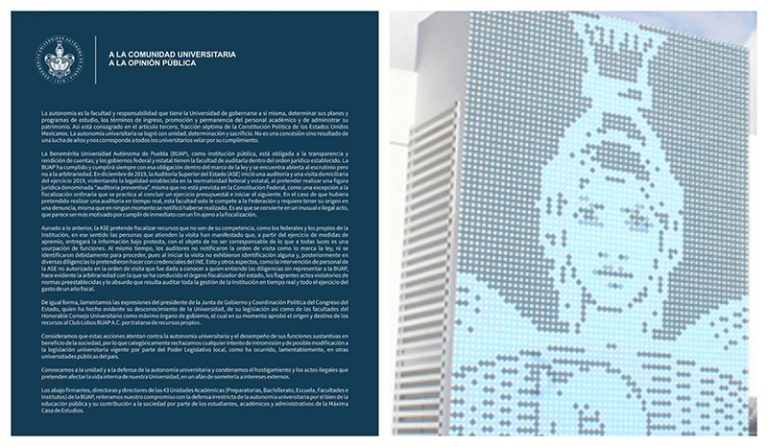 Además, los directivos de las diferentes unidades académicas de la BUAP hacen un llamado para defender la autonomía universitaria.